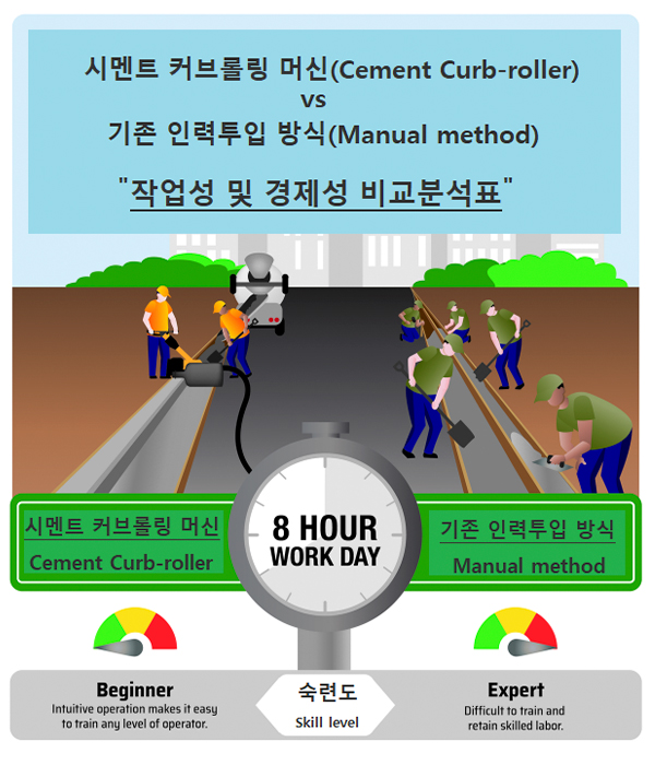 경계석, 배수로, 경사면 마감 등 굴곡/라운드/경사면 형태의 시멘트 공사를 획기적으로 기계화하여 공사기간과 투입인력을 대폭 줄이고 공사비용을 절감시키며 정밀시공을 가능케합니다.